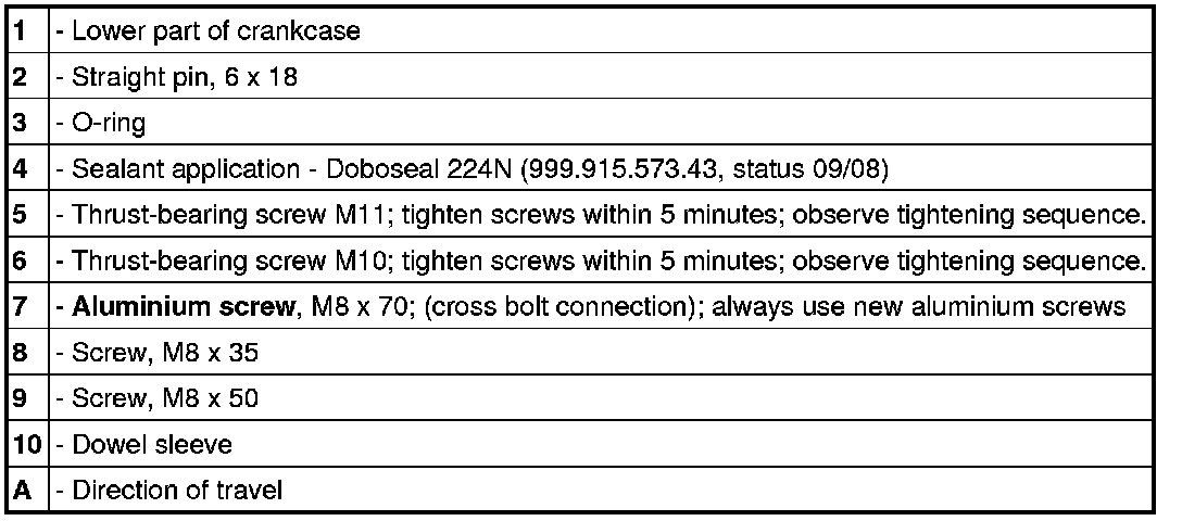 19. Remove crankshaft holding bridge. Apply Doboseal 224N sealant (999.915.573.43, status 09/09) to the lower part of the crankcase as shown. Insert sealing ring -3- into the upper part of the crankcase and position the lower part of the crankcase onto the upper part of the crankcase. Insert all the fastening screws, fit to the prescribed tightening torque within 5 minutes and wipe off excess sealant.