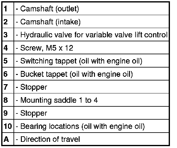 11. Cylinder heads fitted with solenoid valves of the valve lift switchover, camshaft housings loosely positioned and removed camshafts prepared. Alternatively, the camshaft housings, which have been marked according to installation position, can be set down on a clean surface together with the corresponding camshafts. Cam followers and injectors are fitted.