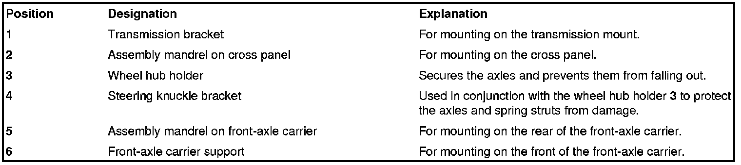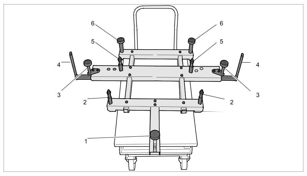 37. Place lifting platform Master Gear unit elevating platform WE 1206 under the vehicle and move all assembly mandrels -1 to 6- to the same height at the correct position.