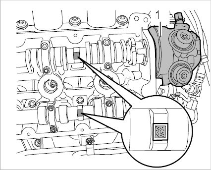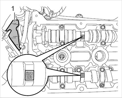 A data matrix coding is shown on the staking dihedron of the camshafts. This is a square black/white dotted marking used for electronic identification purposes during the production process. This marking can be used as an aid when inserting the camshafts into the cylinder head. All four camshafts press against the valves the least when the data matrix coding is facing upwards during installation.