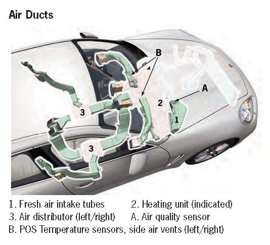The temperature sensor for the side air vent (one each on the right/left side) is not positioned directly on the heating unit. The sensors are located in an intermediate piece just behind the air vents of the heating unit. This intermediate piece (connector) is an integrated component of the underside of the switch panel and routes the air flow to the air ducts, which the side air vents (right/left switch panel) serve
