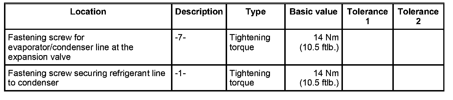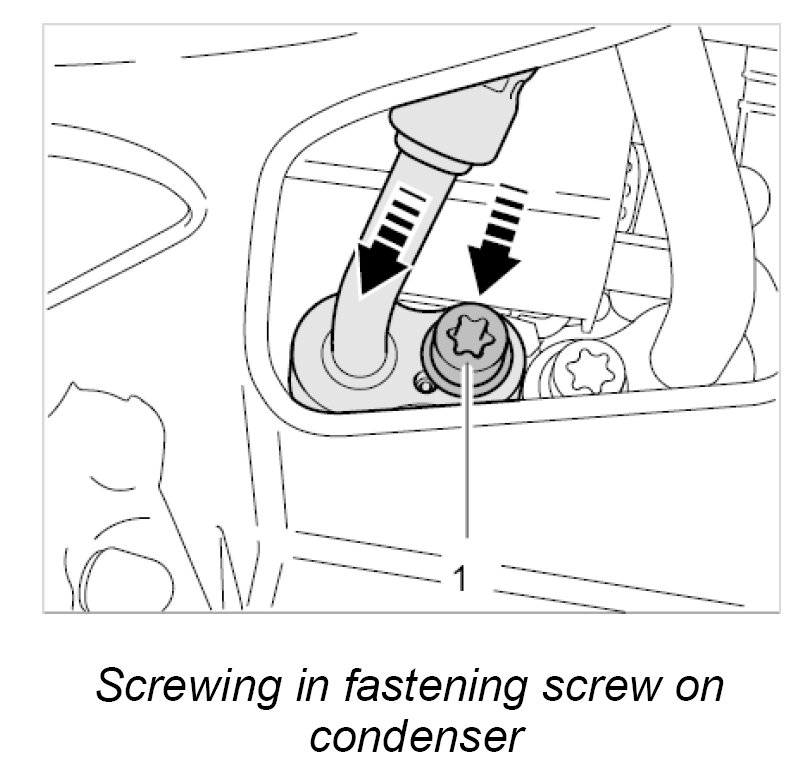 13. Screw in the fastening screw -1- for the refrigerant line at the condenser.