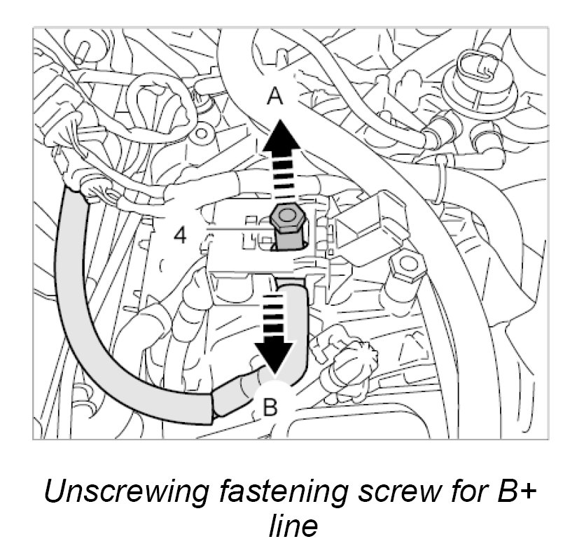 6. Unscrew the fastening screw -4- for the B+ line -arrow A-.