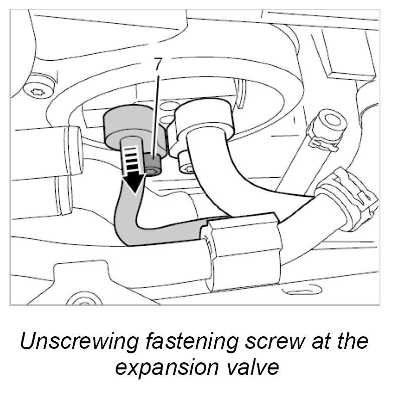 12. Unscrew the fastening screw -7- for the evaporator/condenser line at the expansion valve.