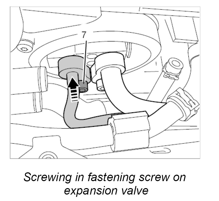 3. Screw in the fastening screw -7- for the evaporator/condenser line at the expansion valve.