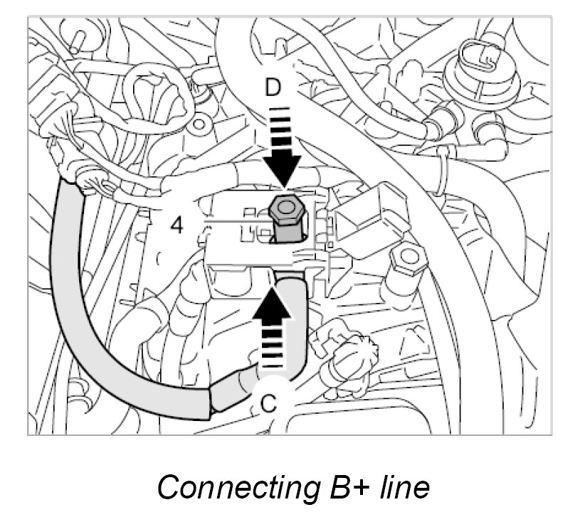 8. Connect the B+ line -arrow C- and secure with the bolts -4- ( -arrow D- ).