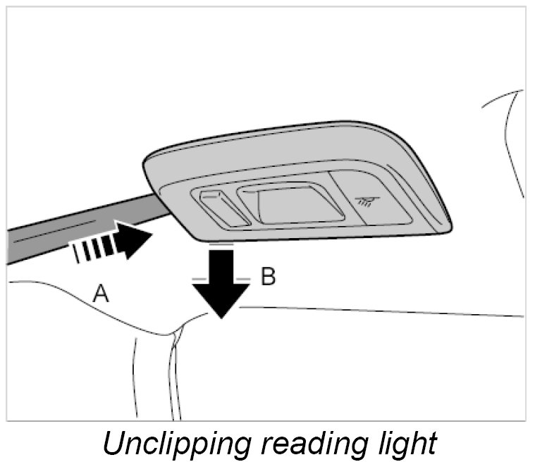1. Unclip the reading light using a plastic wedge -A- and remove it -B-.