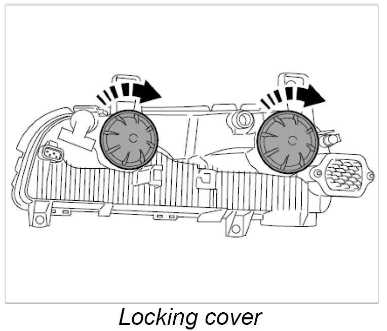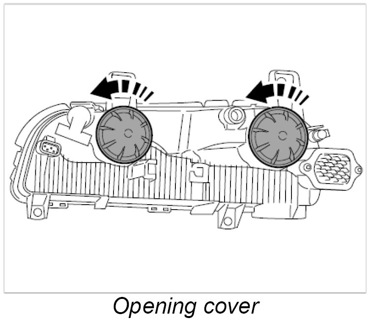 1. Open the cover on the back of the auxiliary headlight. Turn in the correct direction (see marking on cover).