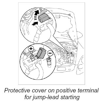 INFORMATION: If the battery is flat, jump leads can be used together with the battery of another vehicle to start the car or to supply external power to the vehicle.