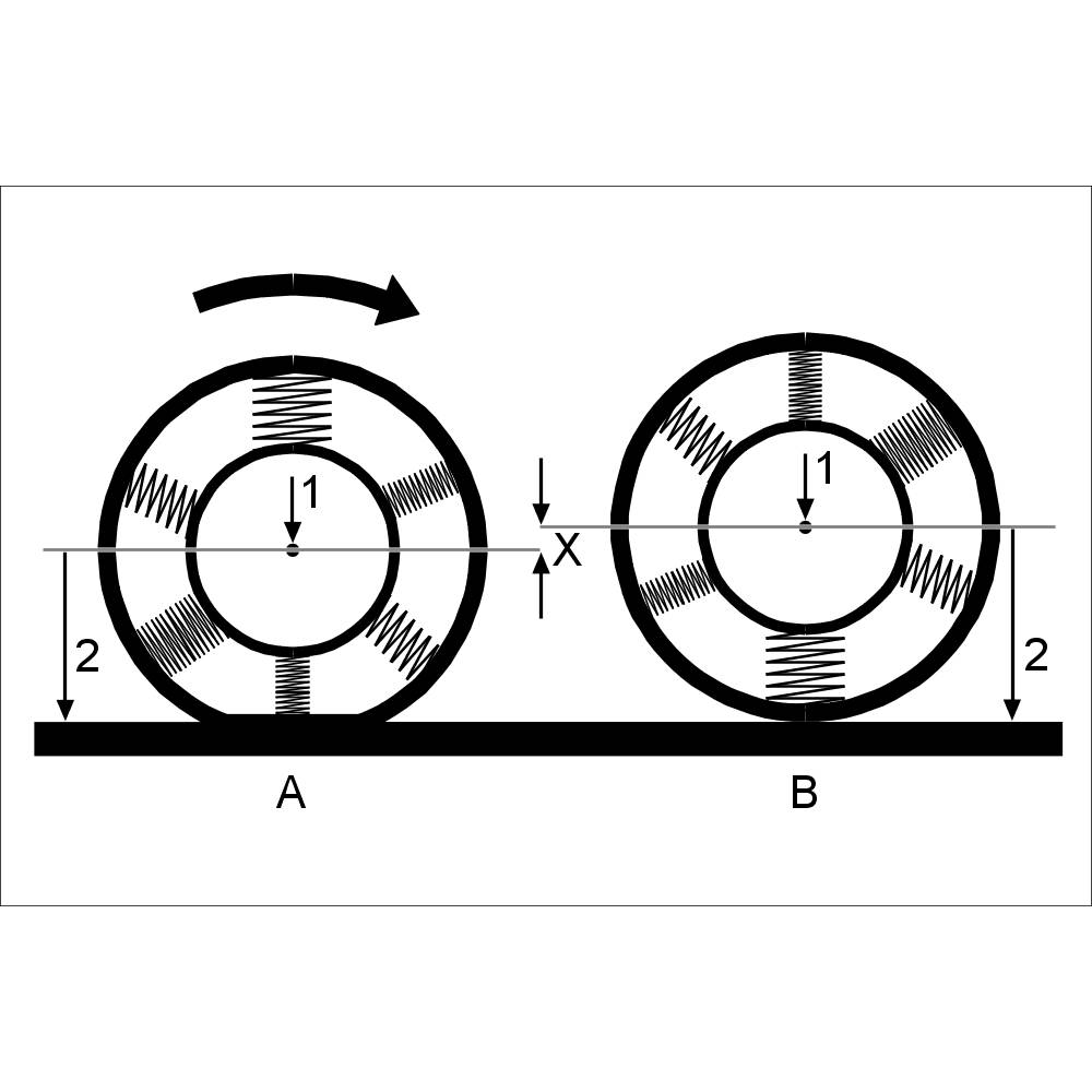 The radial force is a force that compresses a tyre. Based on its size, a tyre has softer ( -item A- ) and more rigid areas ( -item B- ) due to design and production-related factors. Given this, the tyre compresses to various extents at a constant wheel load ( -arrow 1- ) and a constant tyre pressure ( -arrows 2- ). This varying spring action ( -X- ) in the tyre can cause vibrations in the chassis on even road surfaces and the driver may notice this as shaking in the steering wheel, for example. Measuring the radial force variation involves running the tyre on a wheel balancer that measures radial force variation while applying a constant load to the tyre. This simulates the rolling of the tyre on a driving surface. Variations in radial force occur independently of the direction of rotation of the tyre and are measured as the difference between the maximum and minimum radial force ("peak to peak" value).