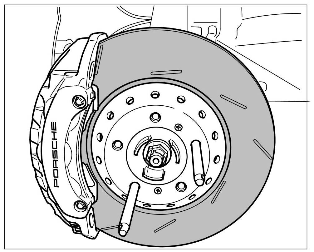 - Use assembly aids (threaded pin for mounting wheel) in order to exclude any possibility of heavy contact of the wheel with the brake disc! The assembly aids (threaded pins for mounting wheel) should be obtained via the Porsche parts service (Part No. 999.571.074.30)!