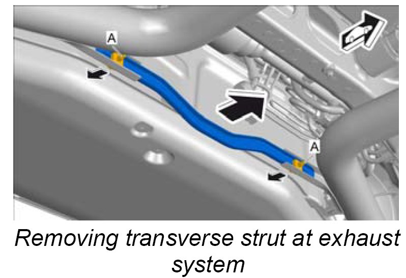 3. Loosen screws on the transverse strut at the exhaust system at the rear and remove transverse strut.