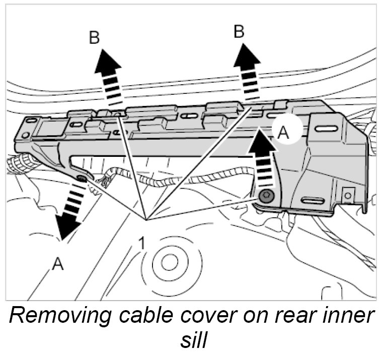 1. Remove cable cover on rear inner sill.
