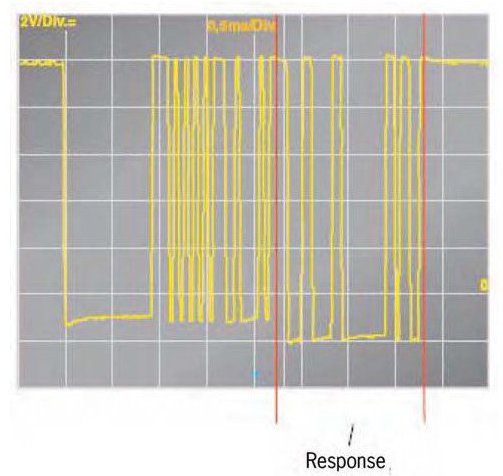 The response consists of 1 to 8 data fields. One data field consists of 10 bits. Each data field comprises a dominant start bit, a data byte (which contains the information) and a recessive stop bit. The start and stop bits are used for synchronization and to avoid transfer errors.