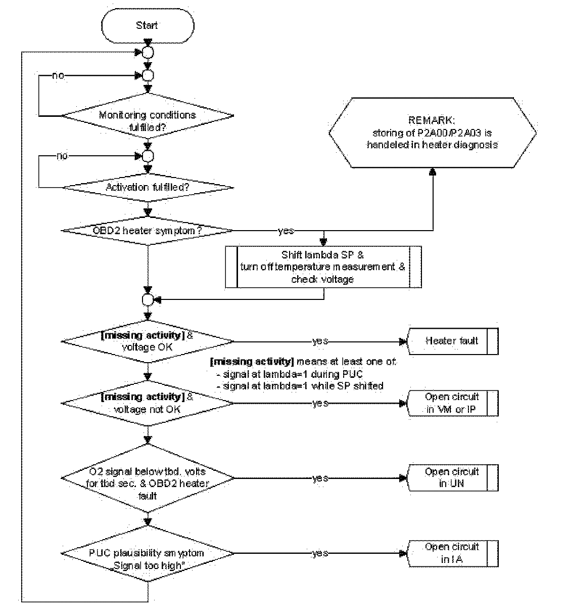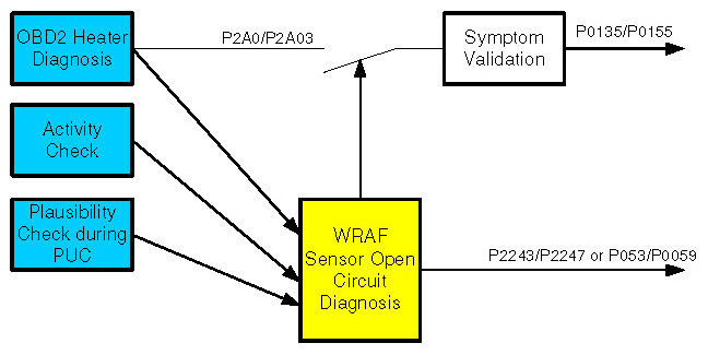 An open circuit in line Virtual Ground or in the line Pumping current can be detected if the sensor signal sticks near lambda 1. The sensor non-activity can be detected by the Oxygen Sensor Signal Monitoring During Fuel Cut-off (signal voltage below e.g. 2..1 V) in fuel cut off or WRAF sens activity check.