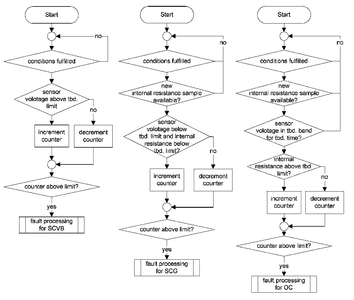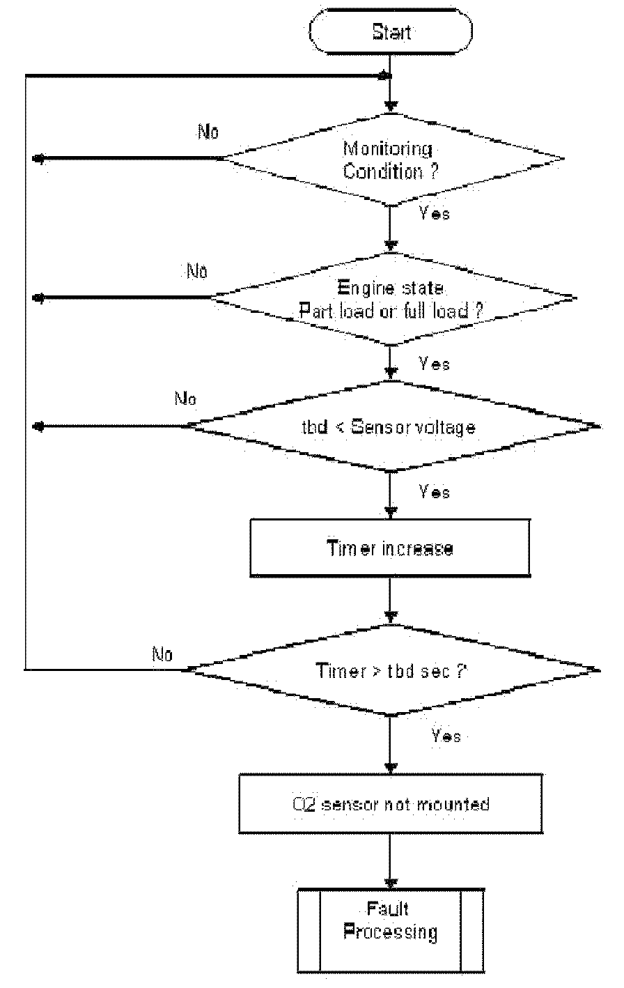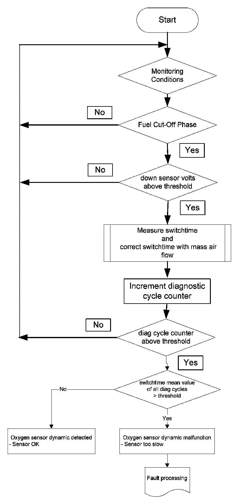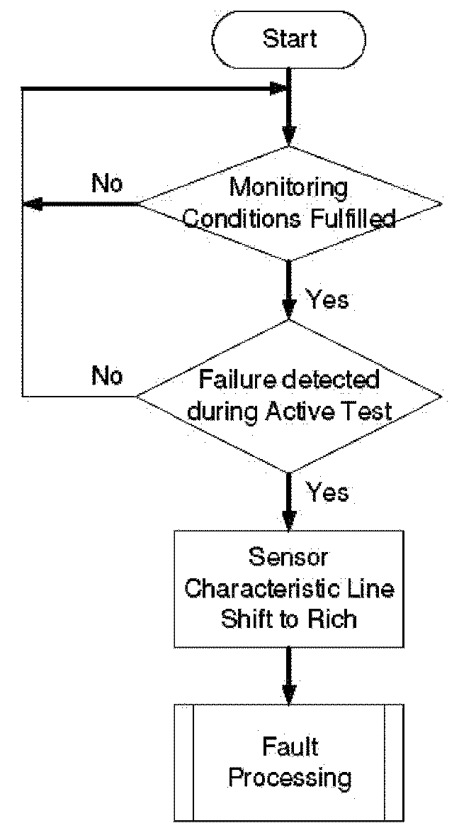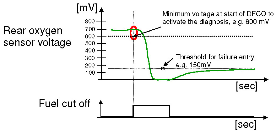 1. Part one monitors the downstream sensor voltage during active fuel trim controller p-share. If the fuel trim control is active, the downstream sensor voltage must be in a band around the trim control set point. If the voltage is outside this band, a mass air flow integral is incremented. If this integral is over a threshold, a malfunction is detected (see also picture below.). When the downstream sensor voltage will not switch to rich before the integral is over a threshold after a fuel cut-off phase, then this fault will be stored, too.