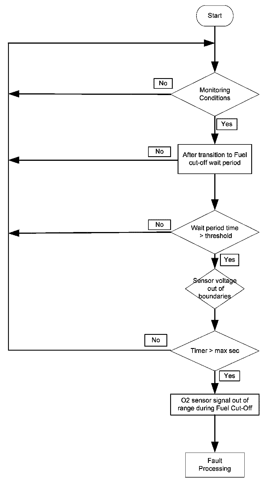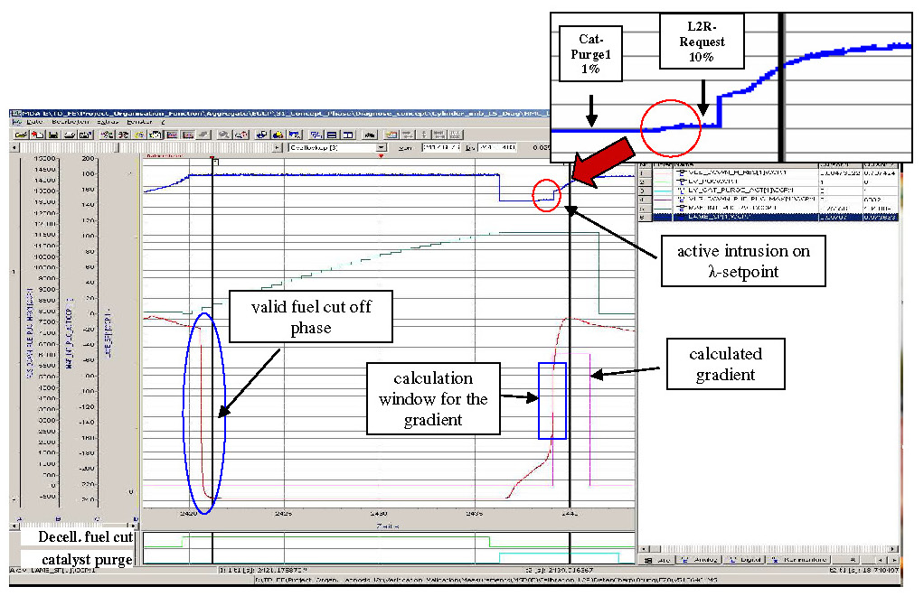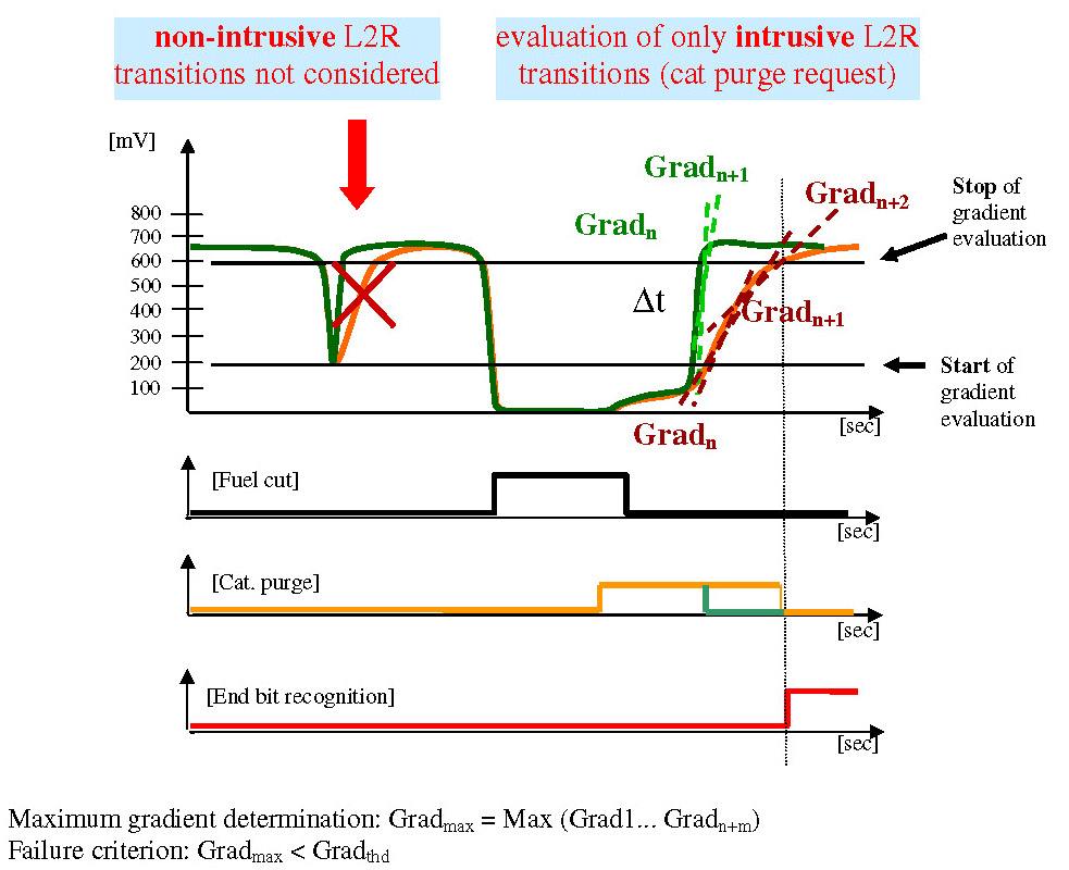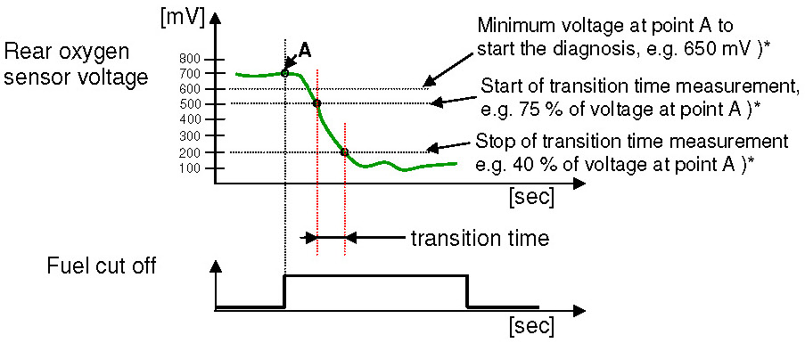 This function monitors the transition time in sensor midpoint range of the downstream sensor voltage. When a fuel cut-off phase starts, the following steps will be executed: