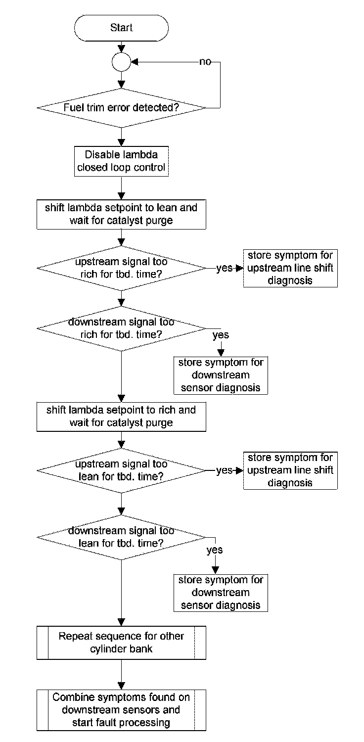If one of the listed fault codes exists, this diagnosis will be enabled to determine if the root cause of the malfunction is due to a stuck signal or characteristic line shift of the upstream O2 sensor or due to a stuck signal of the downstream O2 sensor or a system malfunction, i.e. vacuum leak, injector, etc...