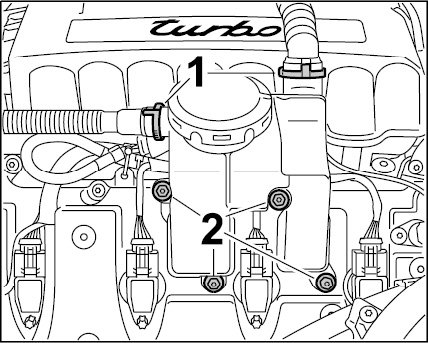 4. Screw in and tighten screws for oil mist separator by hand -2-. Screws are permanently connected. If screws are damaged, press the screws out of the oil mist separator and replace them.