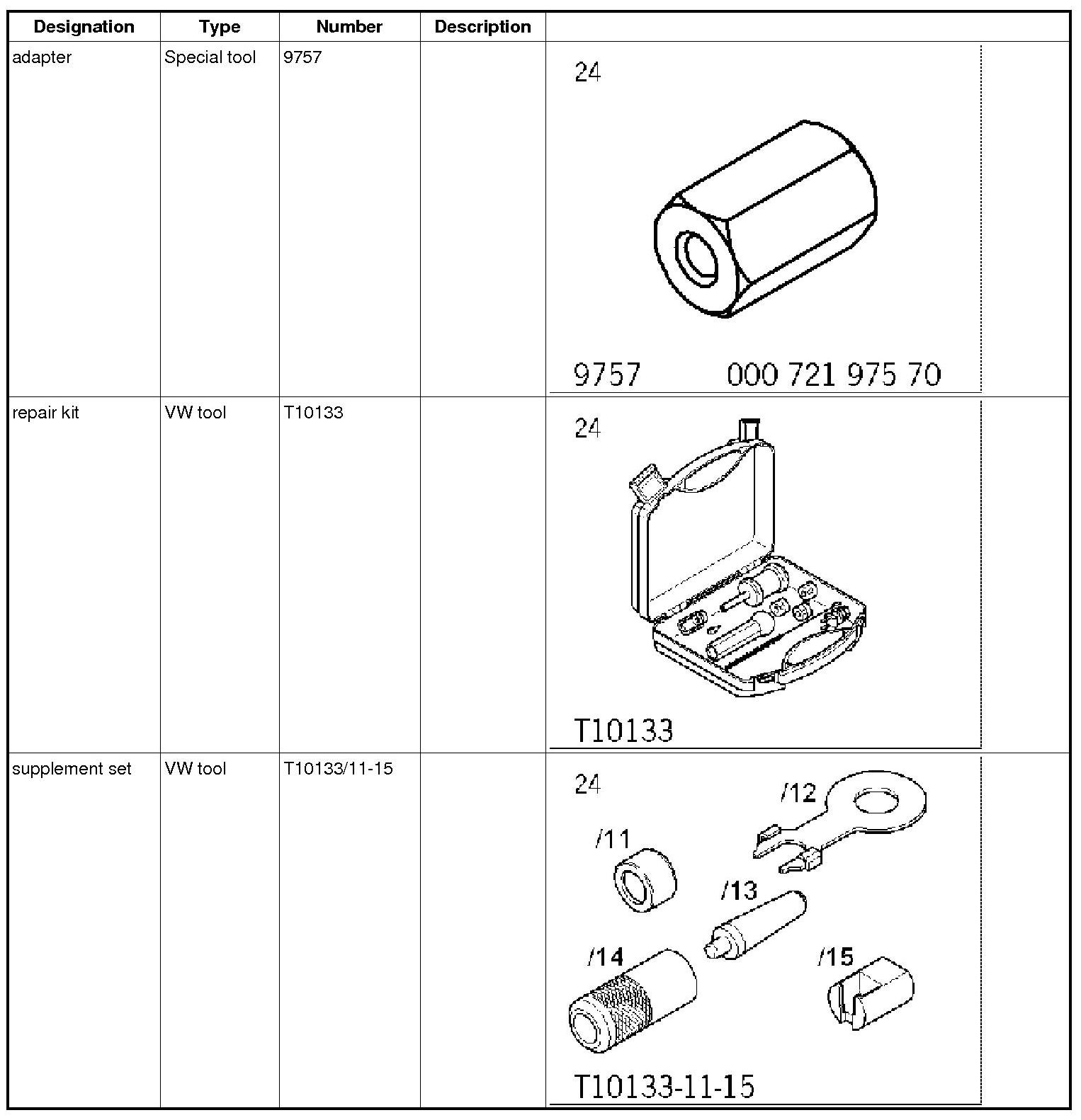 The tool numbers refer to the individual parts of the tools in the repair kit T10133 and the supplement set T10133/11-15 (unless indicated otherwise).
