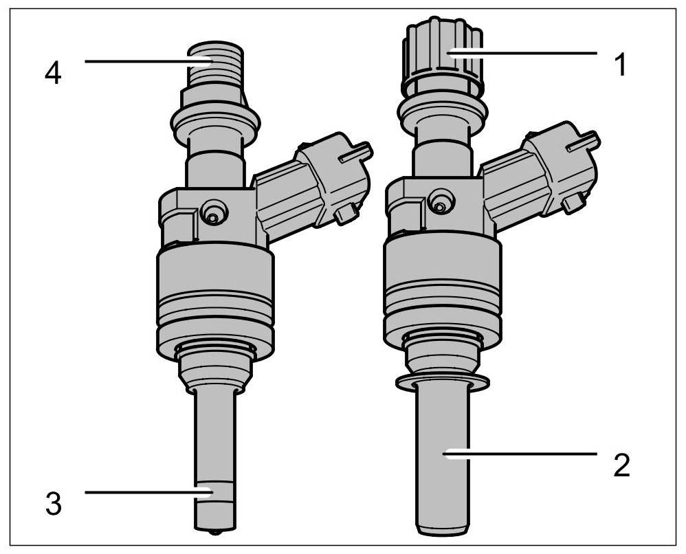 - The high-pressure fuel injectors of the petrol direct-injection system are distinguished from each other by means of colour clips (naturally aspirated engine and Turbo engine). The naturally aspirated engine injector has a blue clip, while the injector for the Turbo engine has a yellow clip. They are visible through a cut-out in the retainer.