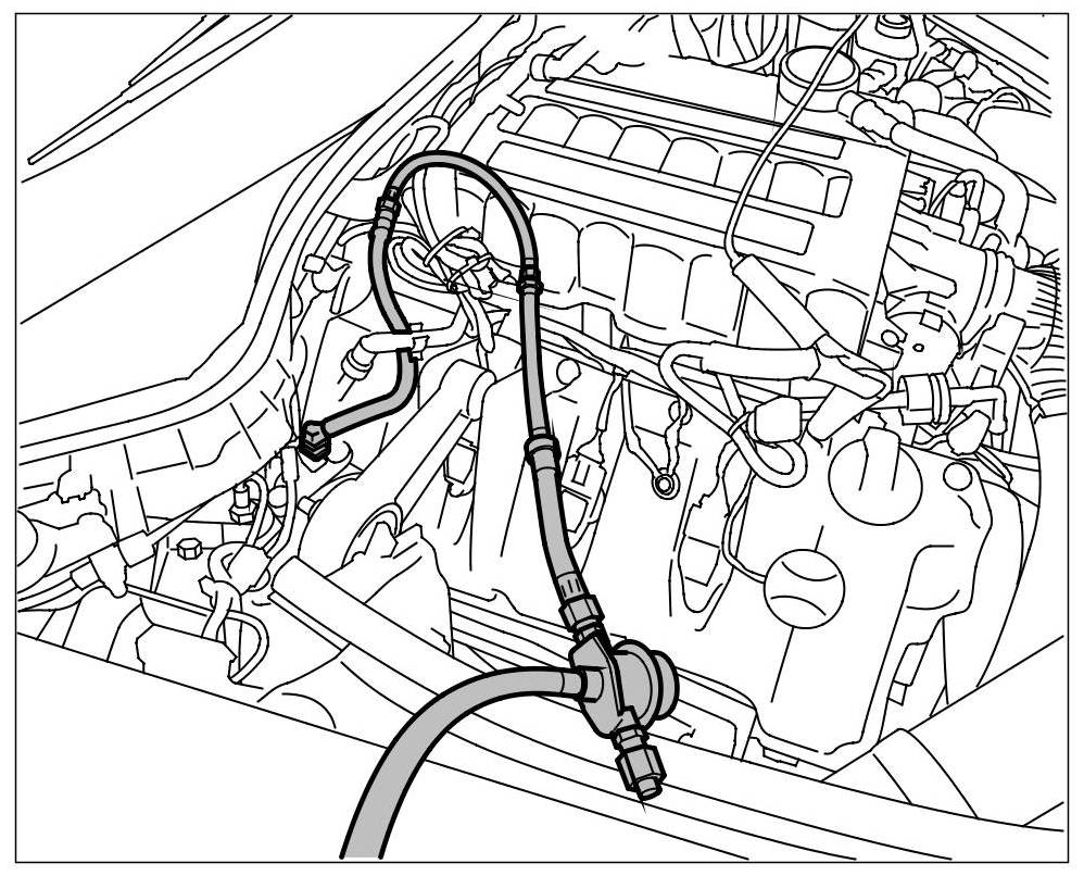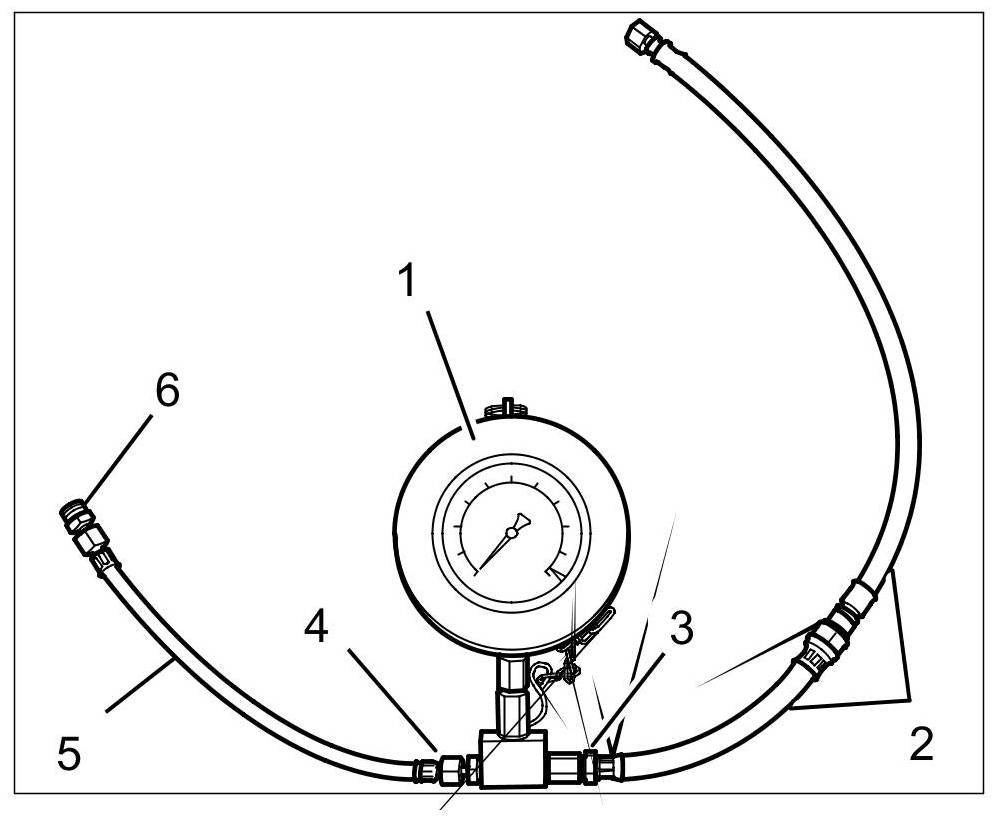 2. Connect the tester to the body-side low-pressure hose. The set-up must be fully sealed. => Measuring tool set-up