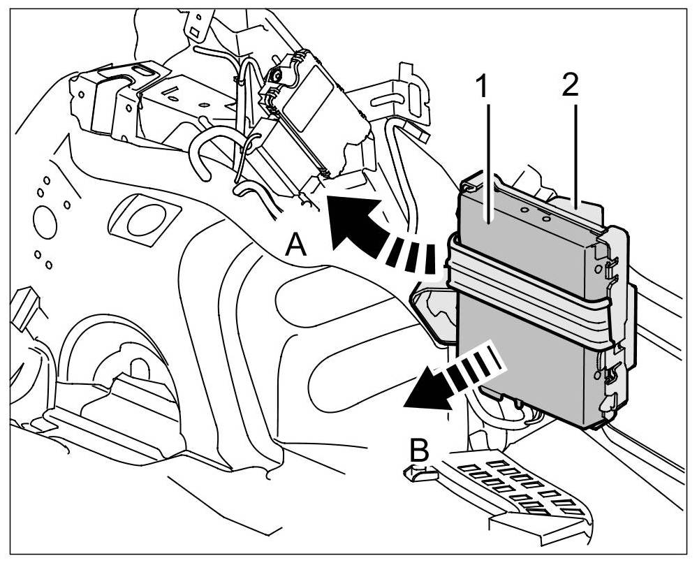 1. Open the lever on the support -2- ( -A- ) and remove the control unit for the reversing camera -1- ( -B- ).