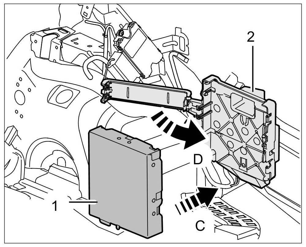 3. Insert control unit for reversing camera -1- into the support -2- ( -C- ) and close the lever on the support -D-.