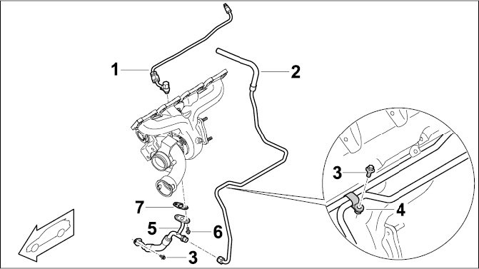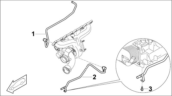 3 - Screw, M6; turbocharger oil extraction line to oil guide housing -> Tightening torque: 10 Nm (7.5 ftlb.) and retaining clip -> Tightening torque: 6.5 Nm (5 ftlb.)
