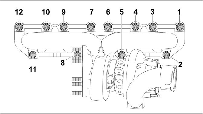 5 - Nut M8; turbocharger exhaust manifold to cylinder head; replace -> Tightening torque: 27 Nm (20 ftlb.)