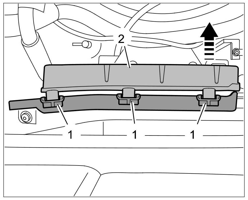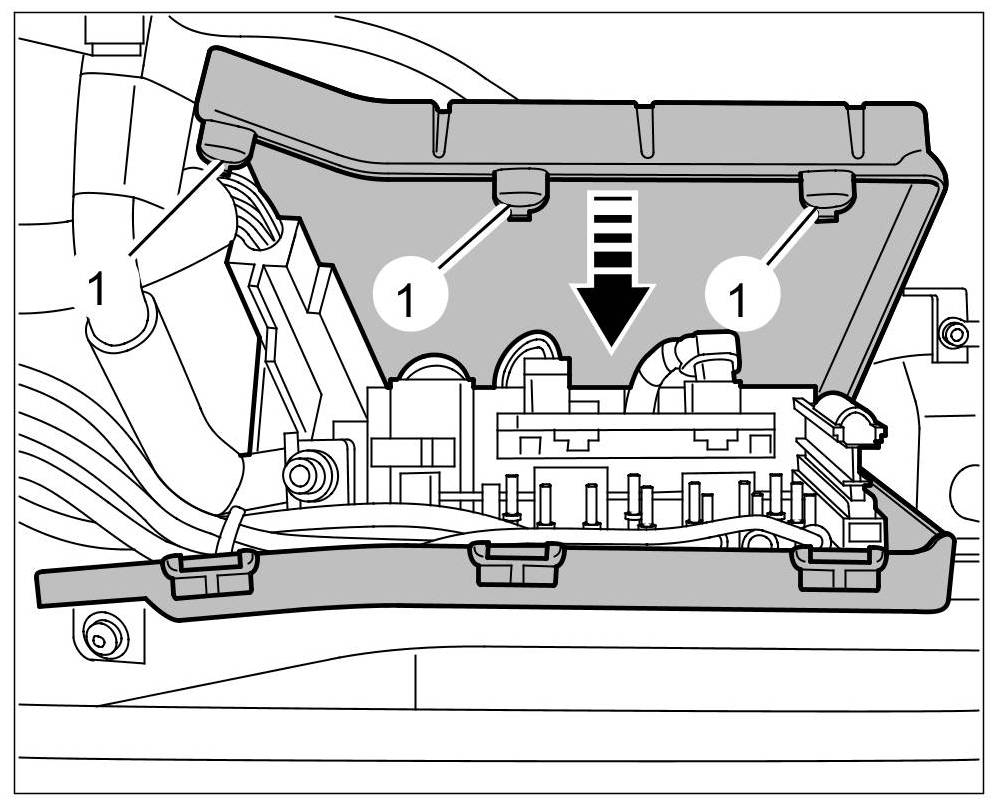 6. Close the main fuse box. Make sure that the three clips -1- engage securely.