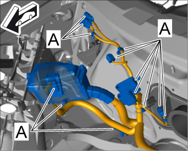 3. Loosen all 13 fixing clips -A- in the front left area of the sub-part and release and pull off all plug connections.
