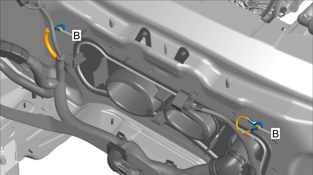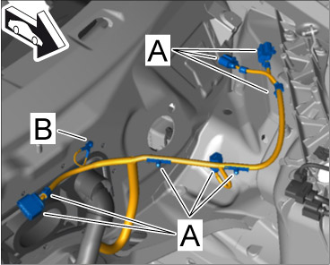 6. Loosen fastening nuts -B- at the two ground points on the firewall and remove ground straps.