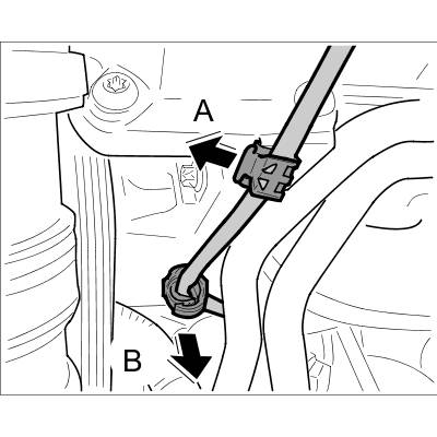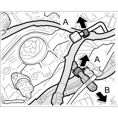 14.2. Unclip engine wire harness at the retaining clip -arrow B-.