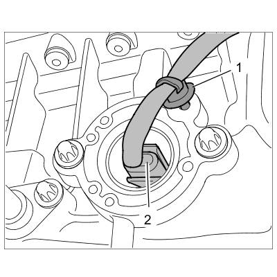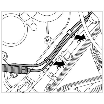 9. Unclip engine wire harness from oil guide housing at the retaining clips.