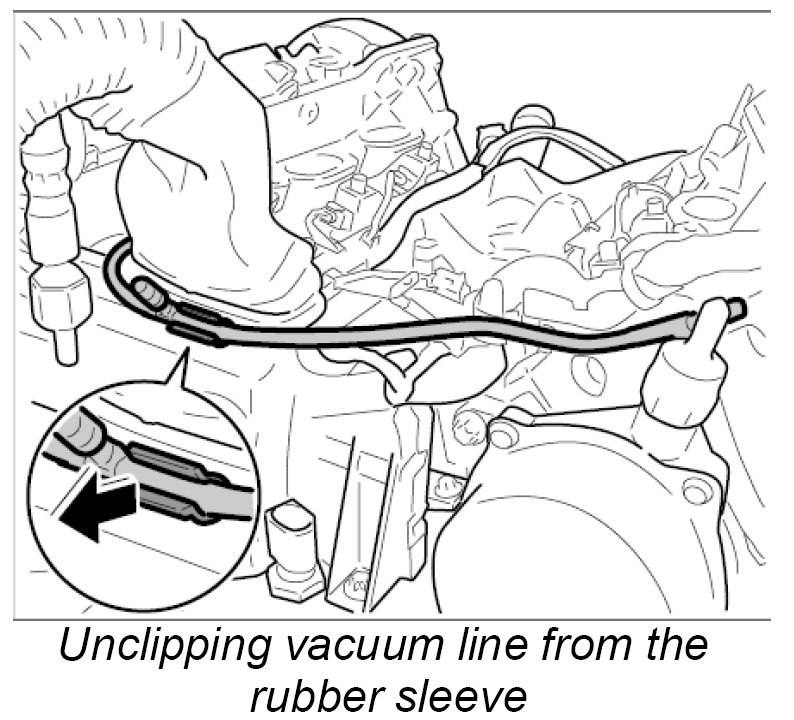 16. Unclip vacuum line from the rubber sleeve -arrow-.
