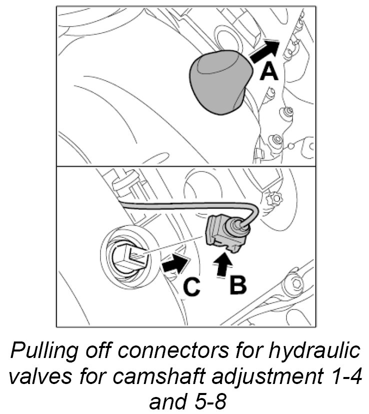 20. Release and pull off connectors at the solenoid/hydraulic valves for valve lift switchover -19 and 20-.