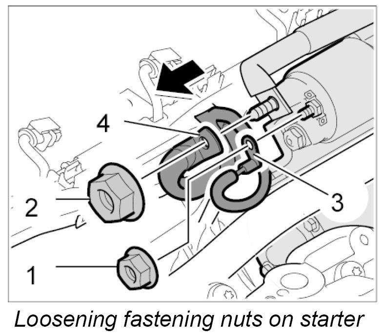 24. Unscrew fastening nuts -1 and 2- from starter and remove lines -3 and 4- ( -arrow- ).