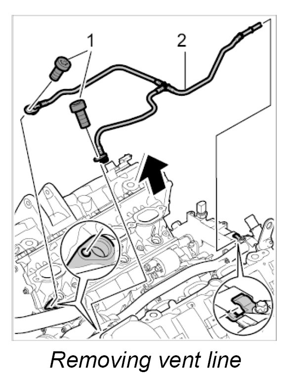 26.2. Unclip vent line -2- from the cable duct and remove it -arrow-.