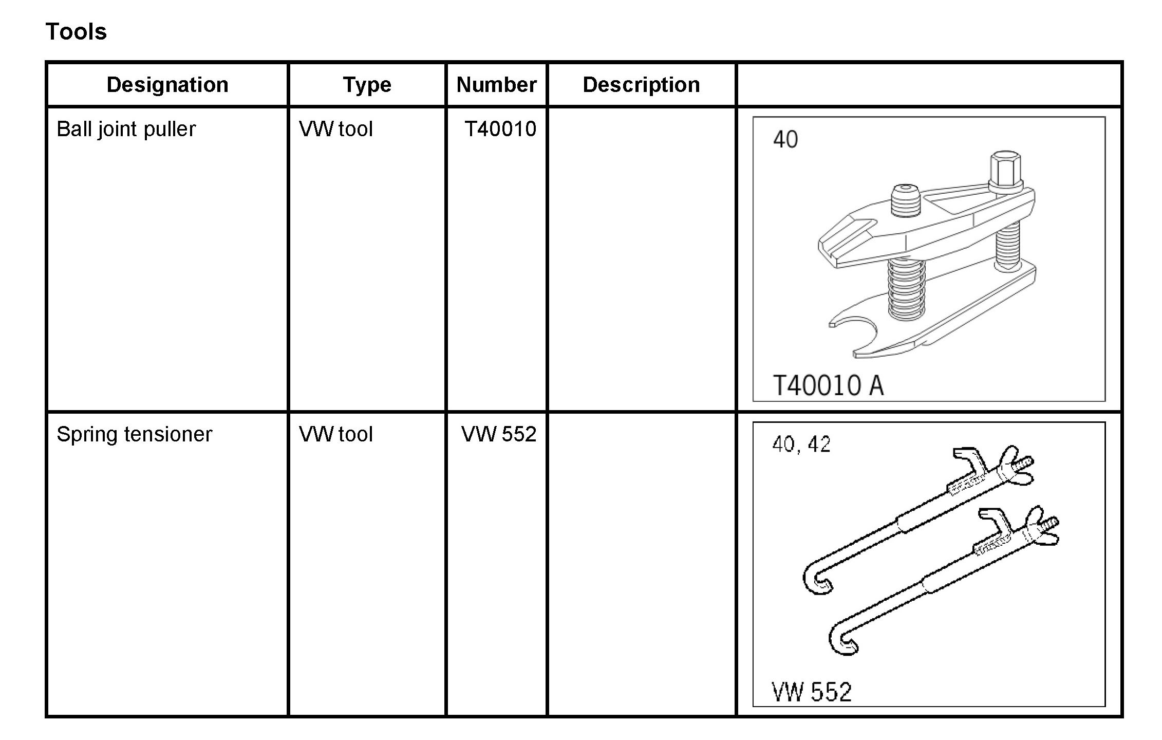 1. Secure upper trailing arm using the spring tensioner VW 552. This involves tensioning the trailing arm slightly because otherwise the top ball joint can become damaged.