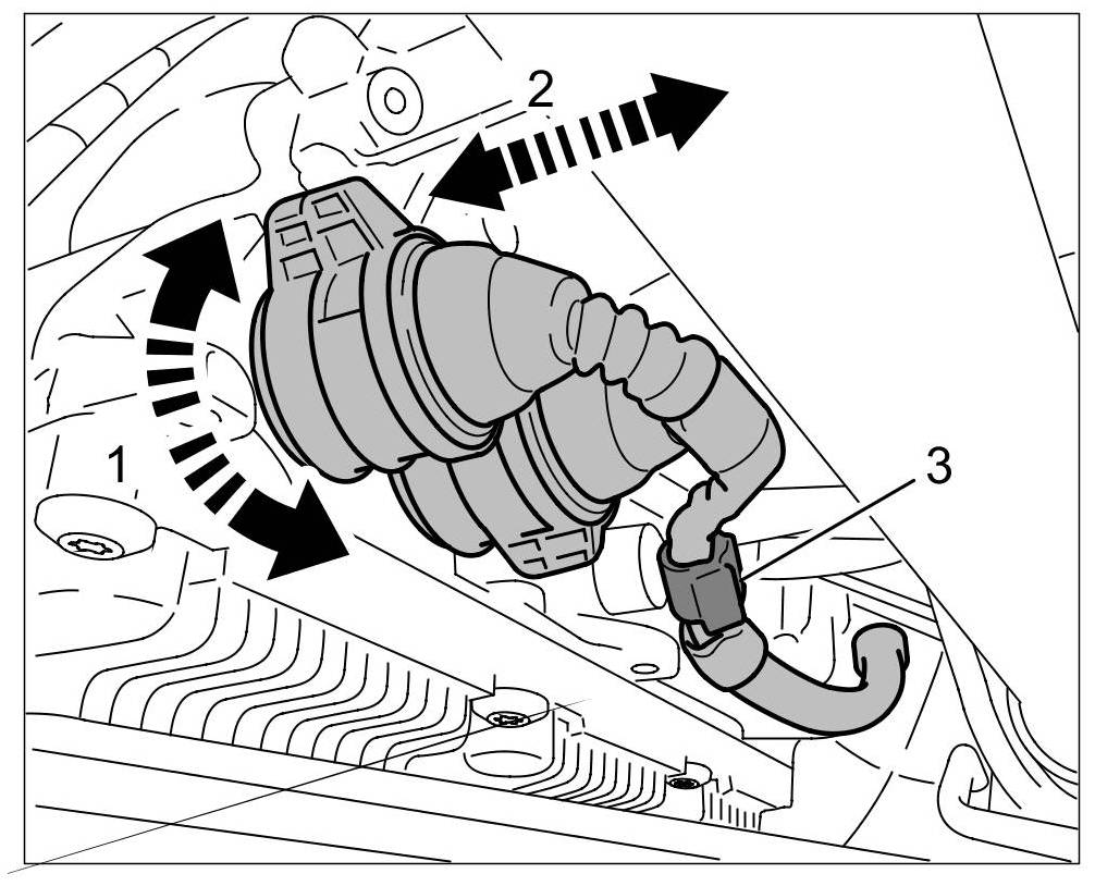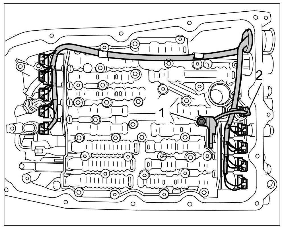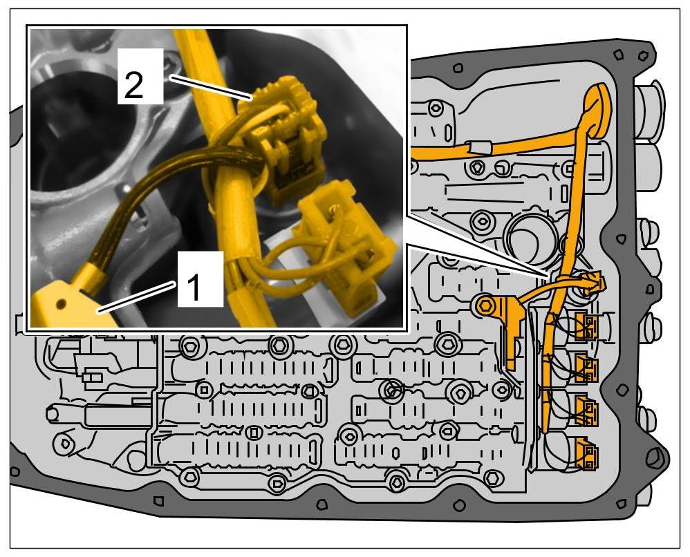 1. Disconnect outer connector on the transmission by turning it 1/4 turn -1- to the left and pull it off -2-. Fit a suitable plastic cap to protect the connector on the transmission side.