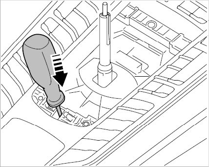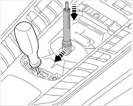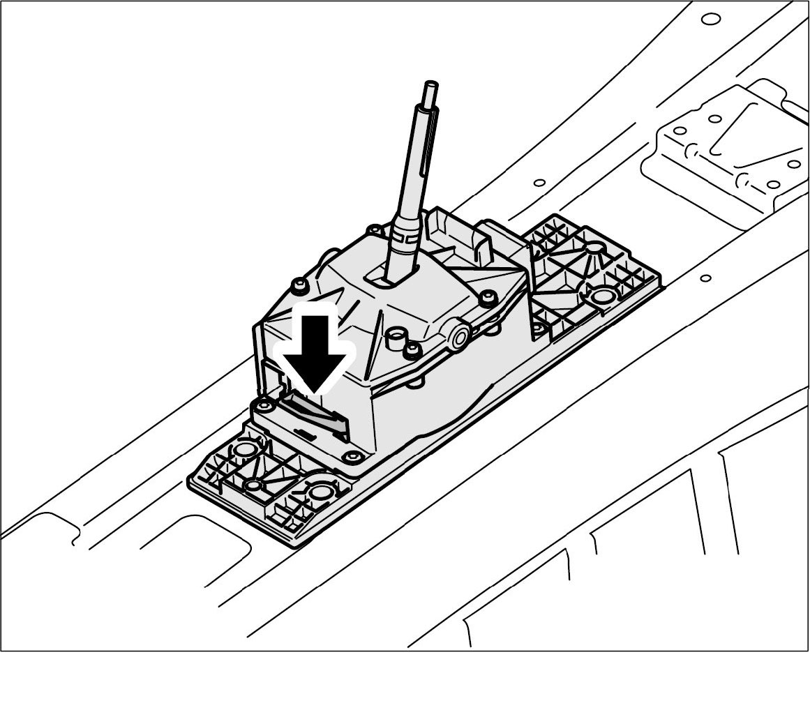 4. Press the release mechanism on the selector support -top arrow- down and pull the selector lever -bottom arrow- back.