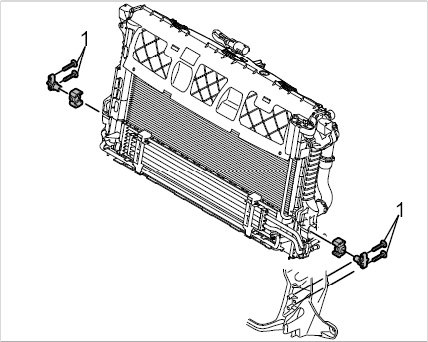 6. Unscrew fastening screws -1- on holder for coolant cooler at the left and right.
