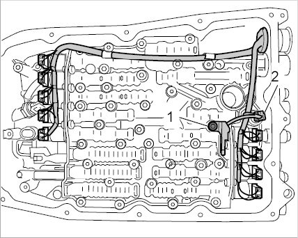 1. Disconnect connector on the transmission by turning it 1/4 turn -1- to the left and pull it off -2-. Fit a suitable plastic cap to protect the connector on the transmission side.