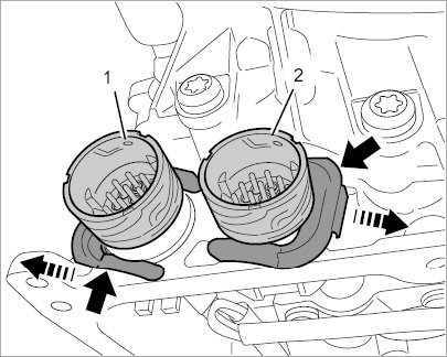 3. The hydraulic control unit must be fitted at the correct position on the connection piece for the oil pump adapter -arrows- and must be flush in the transmission housing.