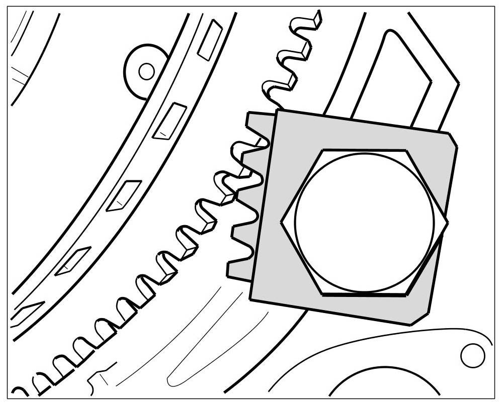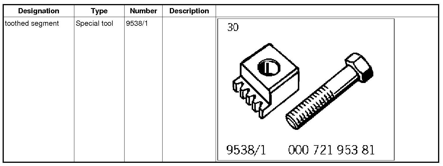1. Block flywheel. To do this, attach toothed segment 9538/1 to a screw hole at the bottom of the oil guide housing so that at least one tooth engages with the ring gear. => Toothed segment