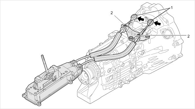 8. Guide rubber sleeve on operating cable through the support and latch cable ends -1- onto the transmission.