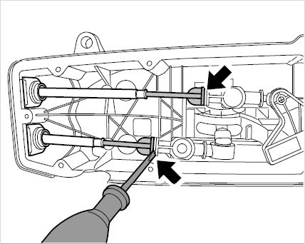 14. Release adjuster from gearshift bracket. To do this, release the catch using a screwdriver -arrow-.