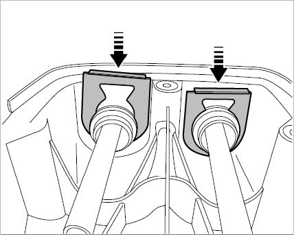 1. Insert operating cables into gearshift bracket and install safety clips -arrows-.