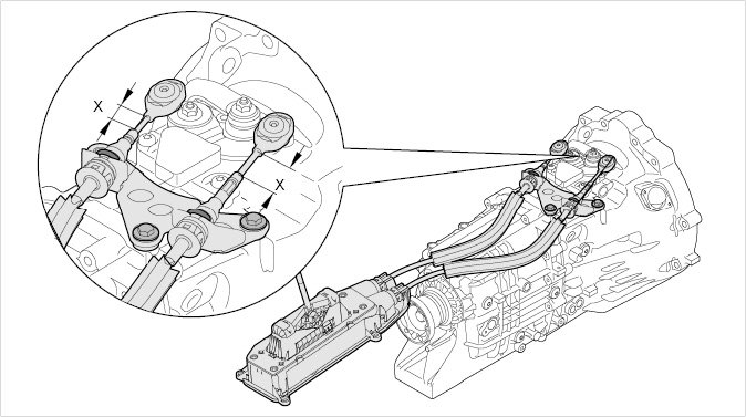 4. When fitting the gearshift bracket, adjust the position -X- of the operating cables before removal and latch in adjuster.